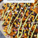We’ve always loved the combination of flavors that you get from sweet potato and black beans (just look at our sweet potato black bean bowls, our vegetarian chili, or our sweet potato and black bean enchiladas). And we figured it was finally time to turn it into nachos!