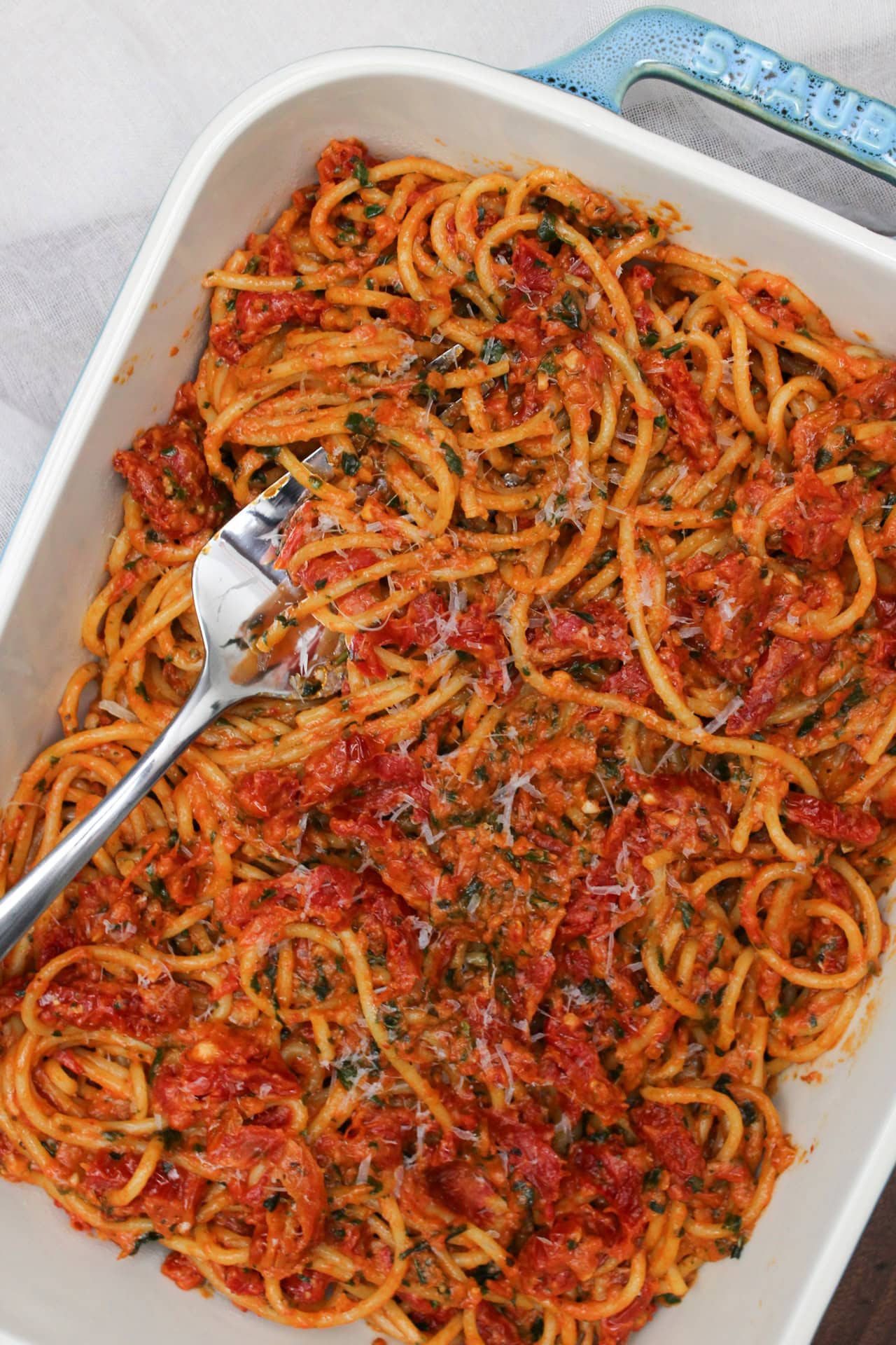 Here’s how to bake sun dried tomato basil spaghetti in the oven: