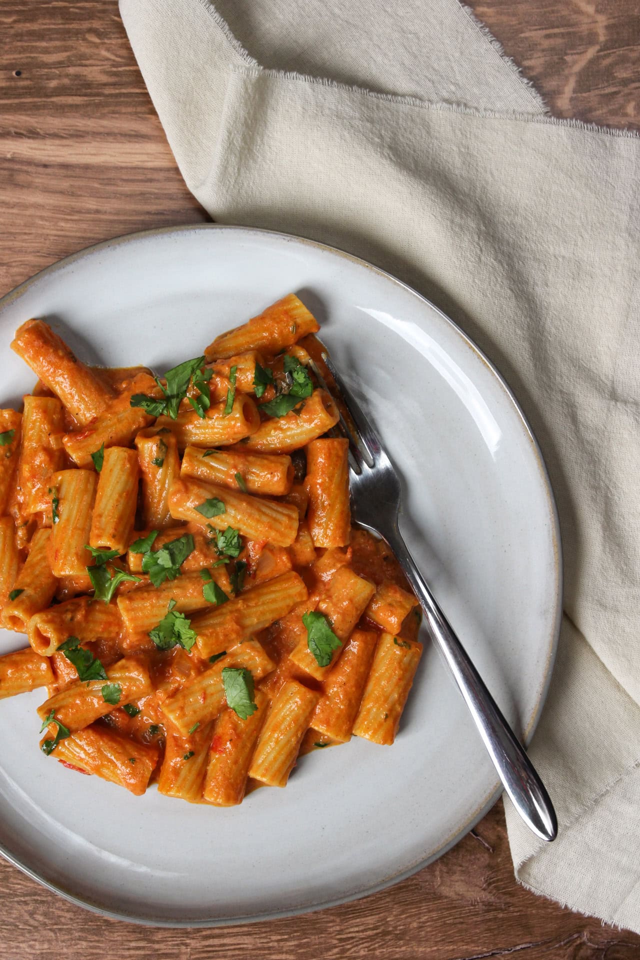 - Add the rigatoni to the sauce and stir to combine. Make sure the pasta is well coated in the sauce, and add a splash or two of pasta water to help it cling.Serve hot, garnished with additional chopped cilantro.